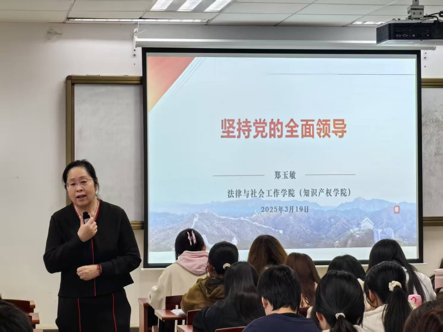 为引导同学们深刻理解坚持党的全面领导的重要性,树立正确的人生观、价值观,3月19日,法社学院院长郑玉敏为2024级法学1班等同学讲授春季学期思政第一课。