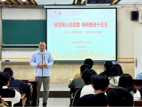 为深入学习宣传贯彻党的二十届四中全会精神,切实落实立德树人根本任务,12月4日,法社学院党委书记杜应发以“锚定民心绘蓝图,砥砺奋进十五五”为题,向全体学生党员、入党积极分子宣讲党的二十届四中全会精神。
