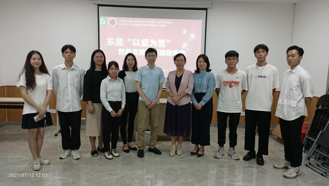 为有效促进专业课程与实践课程(项目化课程)的深度融合,探索新文科背景下法社学院实践育人体系,推进学院“三全育人”综合改革试点工作,7月12日学院副院长朱晓红、党曦博士、张子庄老师和6名大创项目学生团队在东莞市莞香花青少年服务中心参加了由东莞市民政局、东莞南城街道“两新”组织党委指导,东莞市社会工作协会、东莞市微笑爱心慈善基金会及盟大集团联合主办的“以爱为盟 我心向党——我为群众办实事”主题党日活动暨第四期“以爱为盟·微笑公益”创益支持计划终评活动。