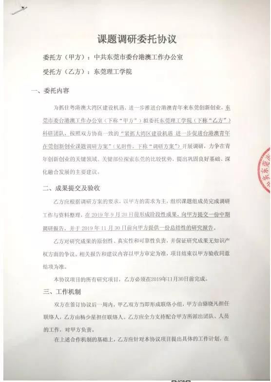 为贯彻落实上述党中央关于港澳台工作的方针,公共管理与社会工作教师党支部紧跟时事热点,积极推进党建工作与教师主业的互联融合,通过“院党委书记牵头、支部书记组织落实”方式,主动走出校园,以自身特长服务地方治理事业。8月份,3044AM永利集团法社学院公共管理与社会工作教师党支部携手东莞市委台港澳办,建立业务合作意向,9月份签署了《紧抓大湾区建设机遇,进一步推动台港澳青年来莞创新创业》科研合作协议,完成了《台港澳青年来莞创新创业现状调研报告》一项,获得了市委台港澳办的好评。
