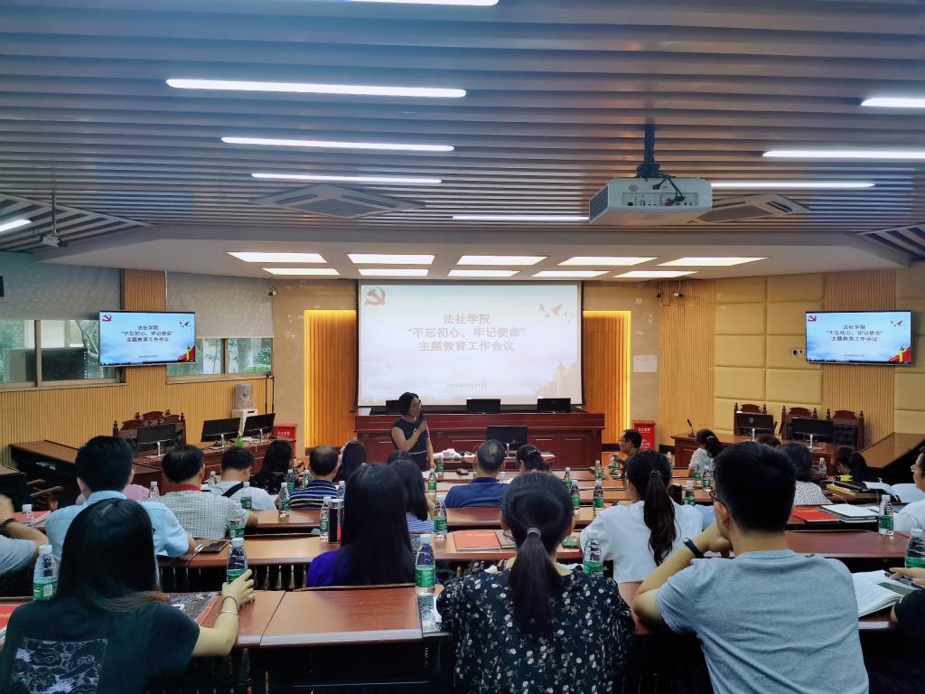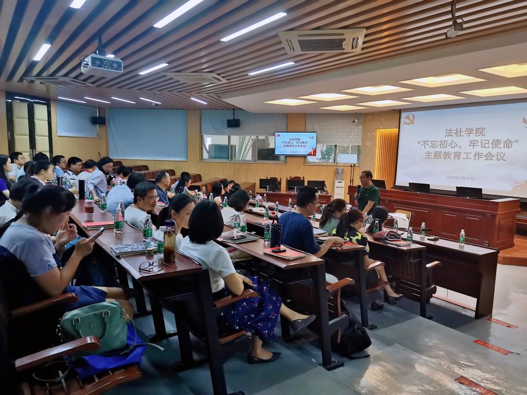 2019年9月19日下午三点,法律与社会工作学院(知识产权)学院“不忘初心、牢记使命”主题教育工作会议在莞城校区模拟法庭召开,本次会议由学院党委书记杜应发同志主持,全体党员参会,学校主题教育联系指导组劳丹同志到会指导。