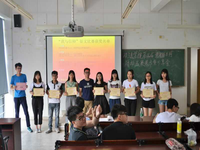 2016年5月5日下午三点,政法学院第三届“党建杯”系列活动成果展示暨分享会于松山湖经管楼216举办。本次分享会的主题围绕“回顾精彩瞬间,感受政法正气”展开,政法学院党总支书记潘荣新、辅导员邱可荣老师、“党建杯”系列活动获奖人员以及党建办全体人员参与了本次会议。