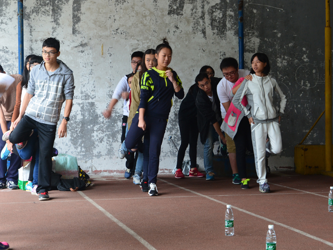 早上9:15,天气湿冷,但党建办全体成员准时集中于风雨跑道,主任叶鲜雯给小干事们简述拓展安排。本次拓展活动分链接加速、极速60秒、五腿足球、你画我猜、众人抬竿、无敌风火轮和绝地反击七个环节,参赛者需要在规定时间内完成第一个环节即可选择接下来的环节顺序,记录每完成一个环节所用时间,最终以用时多少评定名次。接着,干部们把干事们分成了三个小组,而每个小组设有组长,并且拥有专属组名。拓展活动于9:30正式启动。在活动中,新干事们斗智、斗体力地应战,在链接加速的重重失败的打击下,各组不言弃,讨论对策,紧抓着组员的脚继续向前,以直到终点为坚持动力,为进行后面环节鼓舞了士气。在接下来的环节中,仍然见到的是新干事们以“不行再来,总会成功”的坚持不懈的态度来进行活动,斗智、斗毅力表现得格外让人振奋人心,也让干部们看到了拓展的效果。
