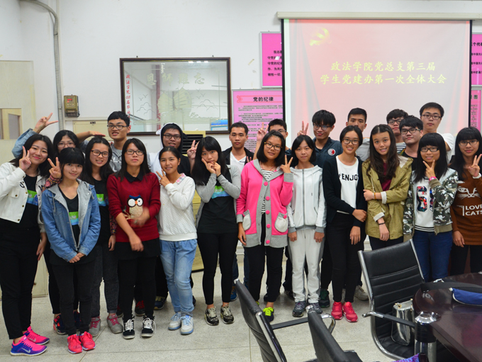 下午3点,党建办在经管楼211举行政法学院第三届学生党建办第一次全体大会。大会分为播放视频、人员自我介绍、新干事分享活动感想、干部发表讲话与颁奖共5环节进行。会上,新旧人员相互熟悉、相互分享,气氛欢乐融洽。下午4:15,全体大会圆满结束。接着,各部长带着新干事进行部门培训。