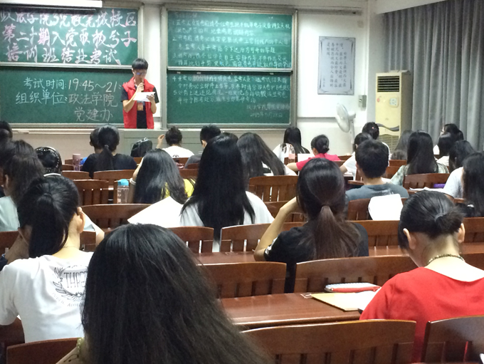 开考时间一到,由党建办工作人员先宣读考试注意事项,然后由监考人员分发试卷。同学们都埋头认真做试题,争取交上一份令人满意的答卷。到考试时间截止为止,考场的纪律和考风都很好,无违纪现象。