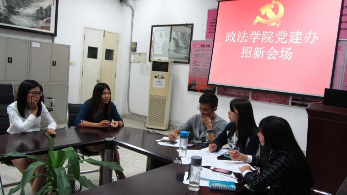 2014年10月14日晚上七点三十分,政法学院党建办松山湖校区招新的面试活动在经管楼如火如荼地开展。
