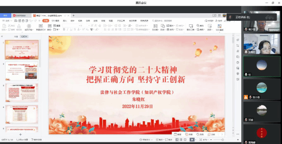 为深入学习宣传贯彻党的二十大精神,11月29日,法律与社会工作学院(知识产权学院)党委委员、副院长朱晓红、沈亚萍为教师党支部全体党员以及非党员教师宣讲党的二十大精神。