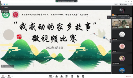 为深入推进“深化课堂教学改革,提升课程思政育人质量”教育教学大讨论,鼓励青年大学生深度挖掘自己家乡的动人故事,记录家乡的幸福生活,成为家乡声音的讲述者和传播者,2022年4月6日,法律与社会工作学院(知识产权学院)组织举办“扎根专业课程,讲好思政故事”之“我感动的家乡故事”微视频比赛,法社学院副院长朱晓红、学公办主任钟丽华、专职组织员黄阳辉、社工系副主任张雪、辅导员黄海娜应邀出席此次活动。