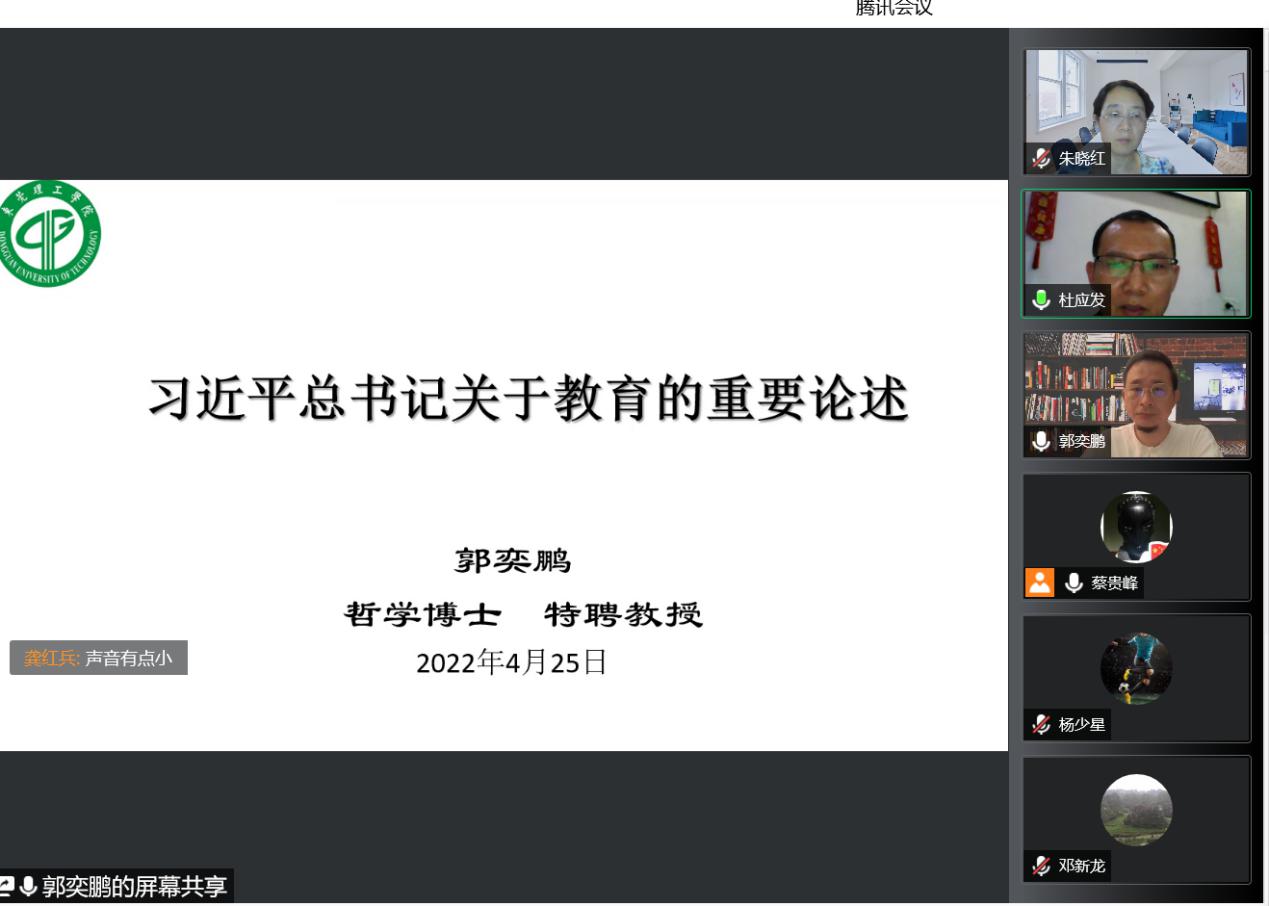 4月25日晚,法律与社会工作学院(知识产权学院)党委邀请马克思主义学院党委副书记、特聘教授郭奕鹏为学院全体教师作“习近平总书记关于教育的重要论述”的专题讲座。会议由学院党委书记杜应发主持,法社学院全体教师参会。会议采用线上直播的形式进行。