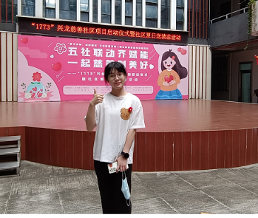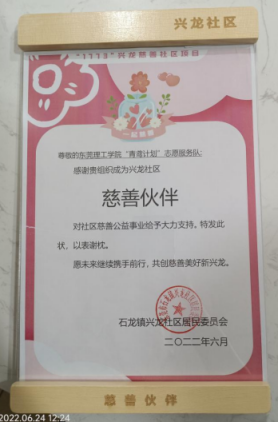 活动开始,社工们为同学们都别出心裁地戴上小红花,意味着大家一起做好事,让善念彼此传递,如此暖心、有趣的公益活动让同学们非常感兴趣。本次启动仪式中的一个重要内容是向长期以来支持兴龙社区慈善发展的慈善伙伴授予感谢状。法社学院与石龙镇兴龙社区于2020年5月共建校外教学实践基地,开展了丰富的学生社会实践活动,此次活动,法社学院“青鸢计划”志愿服务队也很荣幸成为了兴龙社区1773慈善社区项目的慈善伙伴之一,2021级法学卓越班冯祖儿同学作为代表上台接受了感谢状,一起感受社区慈善的氛围。后续“青鸢计划”志愿服务队将持续参与到石龙的慈善活动中,为社区慈善注入青春活力。