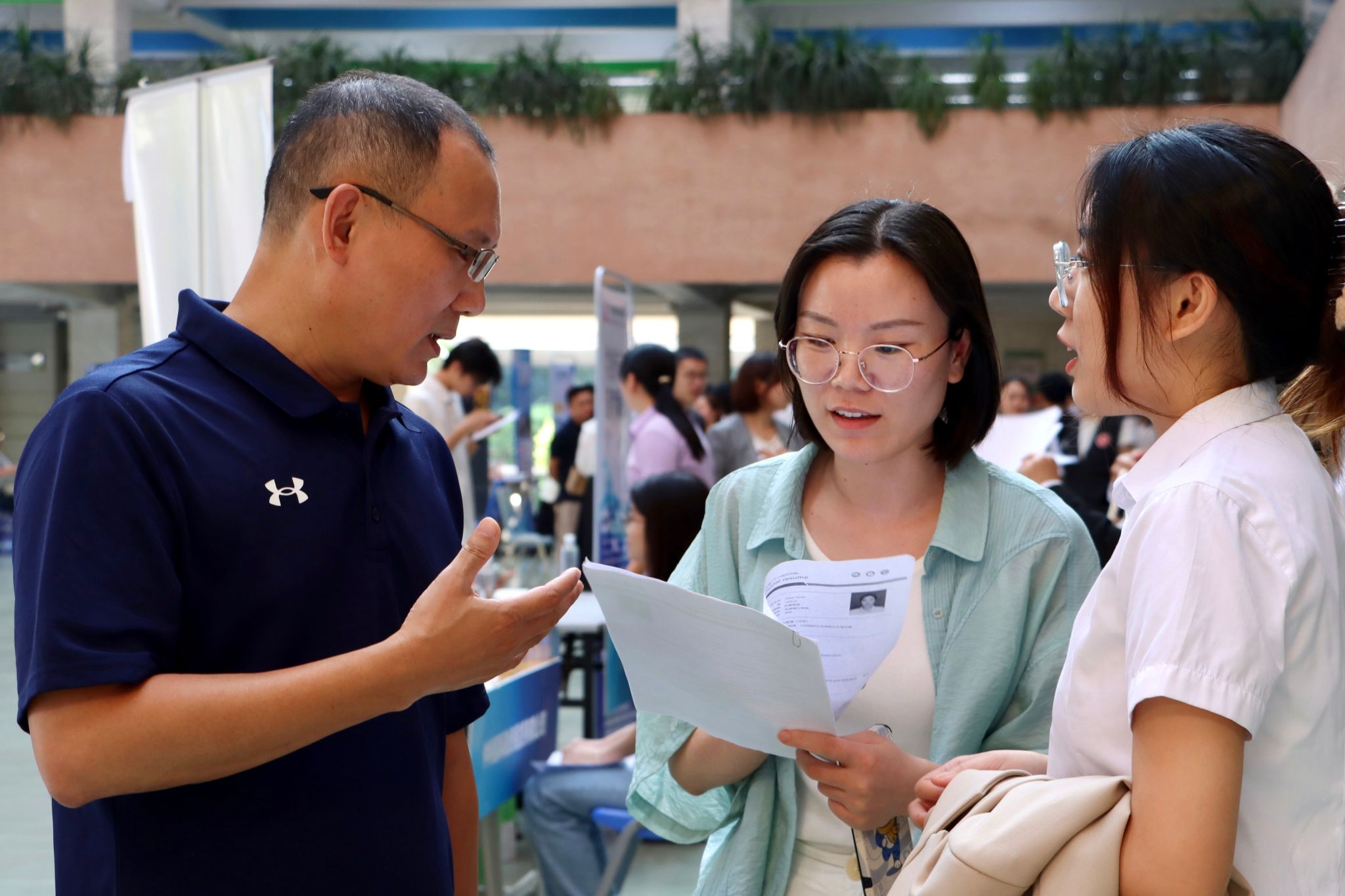 学院辅导员在招聘会现场及时提供就业指导服务,指导学生简历完善、为学生分析职业规划等。