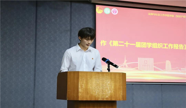 随后,由执行主席陈境洋作第二十一届团学工作报告,对过去一年的团学工作做总结。报告中提到,本学年团学在服务学院和内部建设等方面都取得一定的进步。