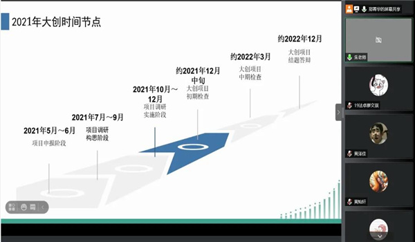 随后,朱晓红老师向我们分享大创项目的关键时间节点。知晓大创项目的各个关键时间节点可以帮助同学们有效规划自己完善项目的时间,做出合适的计划。2021年的大创项目伴随着7月暑假的到来正式展开。在接下来的一年半里,我们将不断地完善充实我们的项目,接受老师、学校对我们的考验。相信在大学的时光里,大创训练项目会成为同学们难忘的回忆。