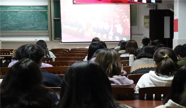 紧接着,视频中学生代表涂志豪、常铭珂分别分享学习习近平总书记“七一”重要讲话精神的体会和学习奋斗心得。涂志豪同学指出,新时代青年要坚持理想,在时代中练就本领。常铭珂同学表示新时代大学生要肩负起让国家强起来的使命,将实现文化强国作为青年永远为之奋斗的方向和目标。现场气氛严肃,每个同学都在认真观看与思考。