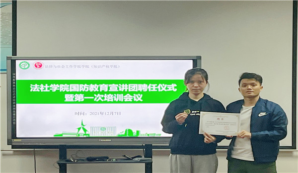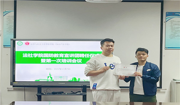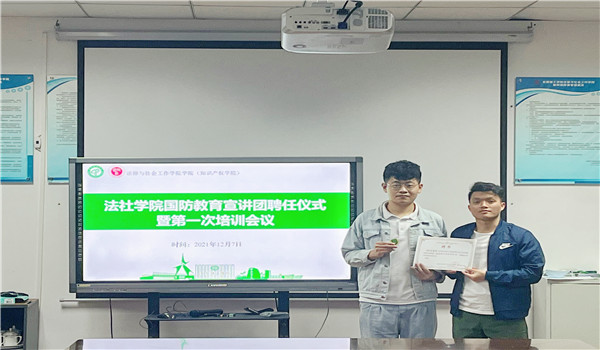 为加大国防教育宣传力度,推动大学生参军入伍宣传工作迈上新的台阶,12月7日,法社学院第二届学生国防教育宣讲团聘任仪式在莞城校区5201会议室举行,辅导员邹欢老师以及第二届学生国防教育宣讲团全体成员出席。