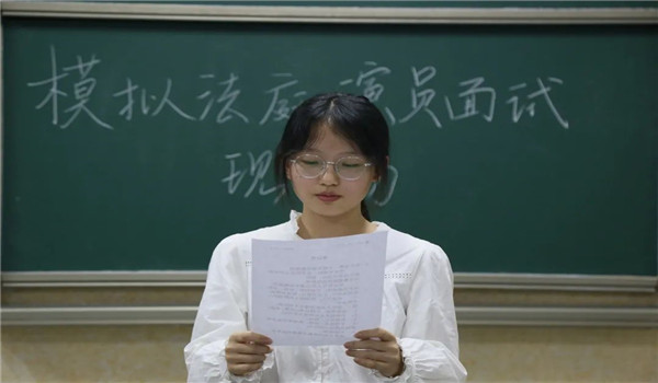 选拔开始前,同学们需在等候室签到,并按照指定顺序前往面试室参加面试。选拔开始,同学们首先做一个简短的自我介绍,简单阐述对模拟法庭及角色的了解,之后确定要面试的角色并开始演绎。他们需根据不同角色的台词和所需的情绪发挥演技,力求以自信从容的姿态和流利的语言打动评委,争取参与模拟法庭的机会。