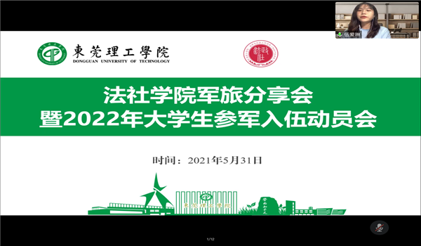 为深入贯彻落实全国大学生征兵工作会议精神,促进同学们深入了解征兵的各方面信息,呼吁同学们积极参军入伍,法社学院于5月31日晚7点在腾讯会议举行军旅分享会暨2022大学生参军入伍动员会,辅导员邹欢出席本次活动。