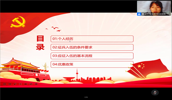 活动伊始,2021级行政管理1班(专插本)的吴晓晓同学分享她的军旅生活并介绍相关信息。吴晓晓同学为同学们分享自己的日常生活训练和在部队经历中的收获,通过她的分享内容同学们充分感受到军旅生活对大学生品质的磨砺和提升。无论是身体上还是精神上,参军经历都让她颇有收获。之后,吴晓晓同学还介绍征兵入伍的基本要求、应征入伍的基本流程和优惠政策,为有意愿参军入伍的同学们提供宝贵信息。