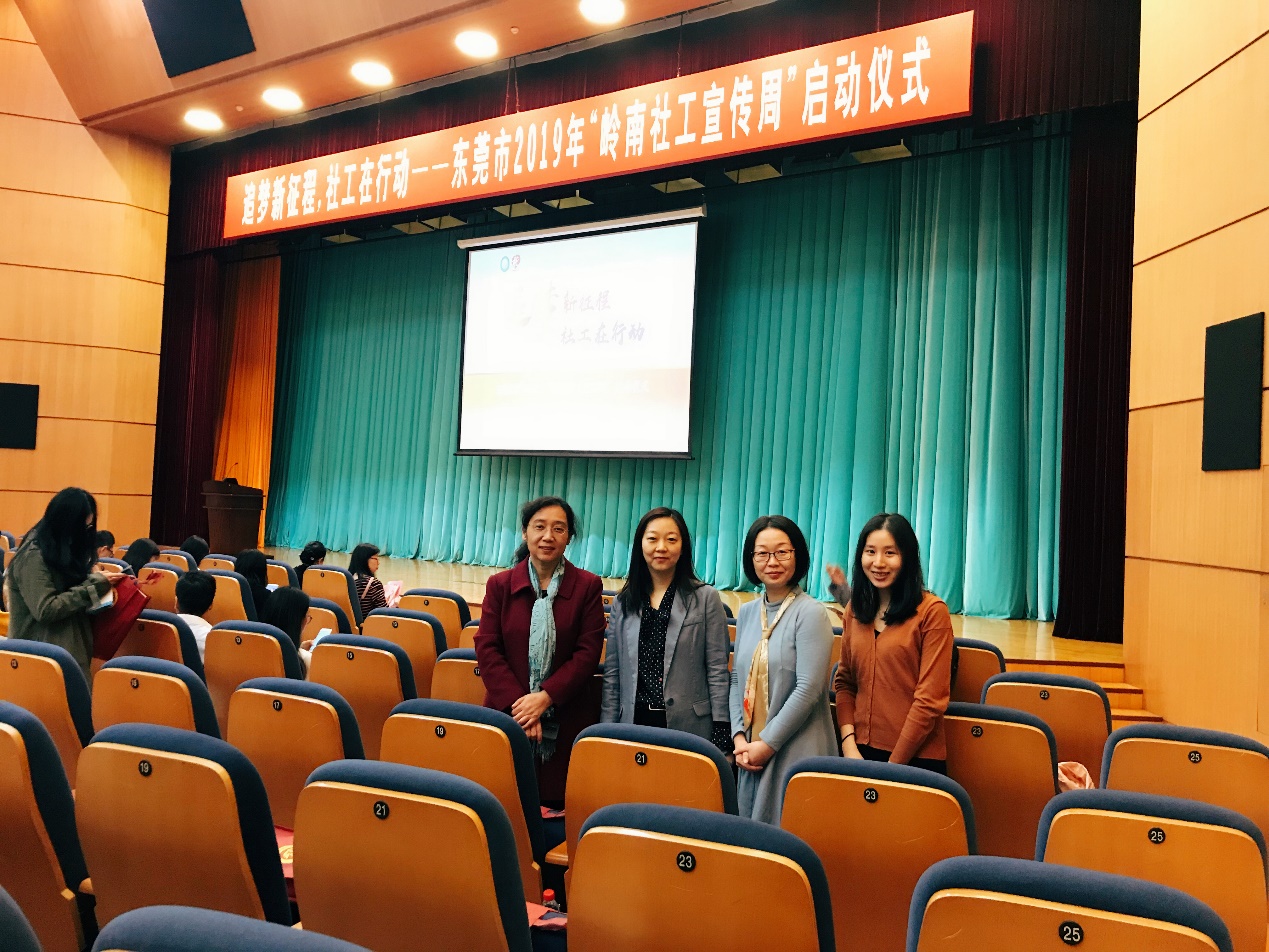 每年三月的第三个星期二是国际社工日,是广大社会工作者的共同节日。2019年3月18日上午九点,以"追梦新征程,社工在行动"为主题的东莞市2019年“岭南社工宣传周”启动仪式在东莞市会议大厦二楼举行。我院副院长朱晓红,社会工作系副教授张燕婷,系副主任张雪,实验员张子庄带领17级社会工作系的同学作为高校师生代表参加了此次活动。