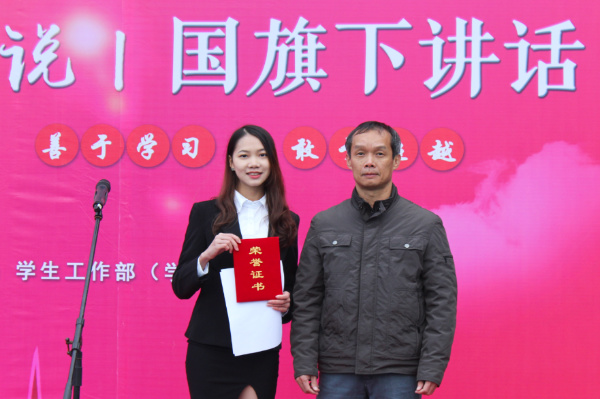 升旗仪式过后,我院学生代表袁慧燕站上“莞工青年说”的讲台,以“我的奋斗”为主题进行国旗下讲话。她表示在踏入莞工校园的那一刻起,便定下了目标,始终秉持艰苦奋斗的理念,积极参与社会实践,挑战新的事物。她通过讲述自身进入大学以来的学习情况和工作经历,向大家叙述了她的奋斗历程以及收获。她认为在学习与工作的同时,也要学会放松自己,为同学们在忙碌的大学生活中合理安排时间提供了意见。坚持每天收获小进步,长时间积累起来便是大进步。她激励同学们坚持奋斗,励志前行。演讲结束后,中法联合学院的执行院长陈毅华为袁慧燕同学颁发了证书并合影留念。