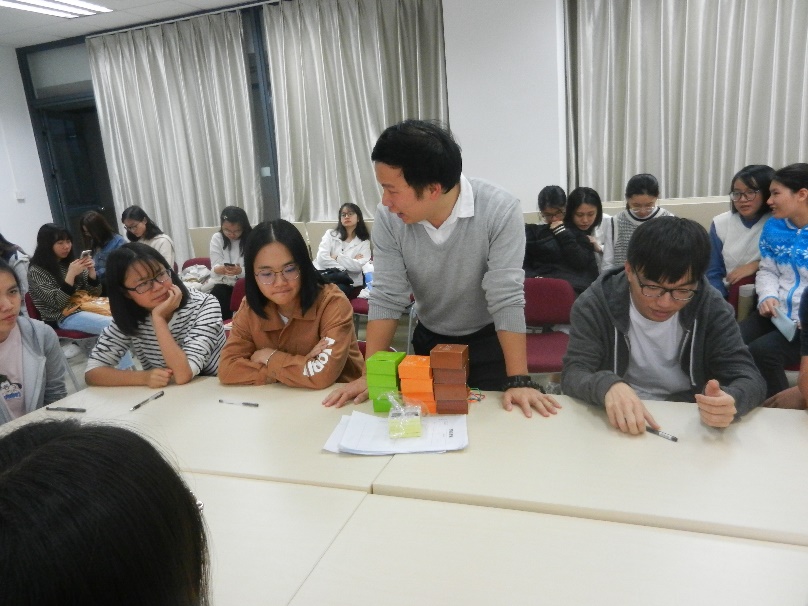 在社工简单的自我介绍之后,我们便正式进入了本次分享的主题--小组工作实务分享。他先为我们介绍了小组服务设计剖析;紧接着,又为我们进行了小组带领技巧详解;最后,他还抽选了一部分同学参加小组服务模拟。
