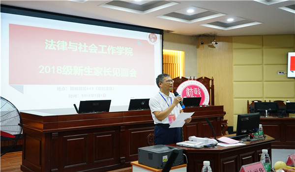 9月1日下午两点半,为促进学院与新生家长之间的交流,营造“家-校”三共育人氛围,让新生家长初步了解学院、了解学生所学专业,法社学院2018级新生家长见面会在模拟法庭举行,强昌文院长、潘荣新书记、夏能礼副院长、丘永辉副书记、辅导员老师及2018级新生家长参加了本次见面会。