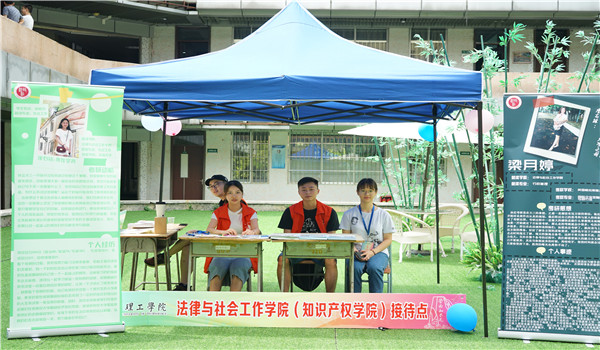 在5号楼、6号楼平台的学院接待点,工作人员向到访的考生和家长展示了学院在文化建设方面的成果,有党日活动剪辑、读书节作品集、法社学院纪念品大礼包等等。同时,高考考生和家长走进学院的办学场所模拟法庭和社会工作实验室,“零距离”感受法社学院的课程特色、教师风采和学生组织活动。