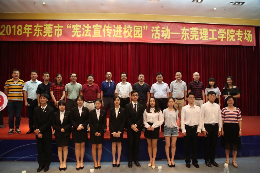 5月24日下午,东莞市司法局、市普法办携手我校法律与社会工作学院,联合东莞电视台、东城街道等相关政府单位在莞城校区学术报告厅举办了“2018年东莞市宪法宣传进校园”普法活动。东莞市司法局副局长袁洪昌、东莞广播电视台副台长郑远龙、东城街道党委副书记吴沛林、我校法社学院院长强昌文及副院长夏能礼等领导出席了活动。 本次活动以情景剧再现了大学生就业性别歧视现象,通过就业平等与否的激烈辩论引发学生学法兴趣与思考,最终以教师点评、宪法知识有奖竞答、集体诵读宪法条文和赠书仪式等环节创新了校园普法的方式,共计吸引了师生三百余人热情参与。 袁洪昌副局长指出,青少年法制教育是全面依法治国战略的基础性工作和长期性工程,把法制教育纳入国民教育体系,并在国民教育体系中系统规划和科学安排是法治建设的重要任务。希望同学们在学习法律与知识的同时要更加注重法治信仰的培育,把法治精神、法治理念根植于心,充分发挥自己的特长,带动身边的人学法、尊法、守法、用法,当好法治理念的传播者、维护者,争做一名优秀的社会主义法治人才。 本次活动将在东莞电视台《与法同行》栏目播出。