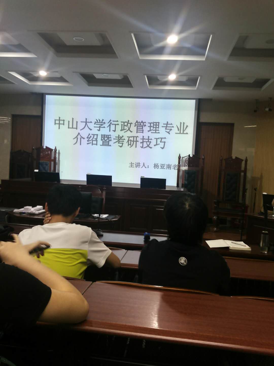 2018年5月9日下午两点三十分到五点十分,“考公经验分享会”以及“中山大学行政管理专业介绍暨考研技巧”讲座于3044AM永利集团莞城校区模拟法庭举行,邀请了法社学院杨亚南老师和2014级行政管理3班的陈绚师姐作为主讲嘉宾,法社学院魏红征老师也出席了活动,行政管理专业100多名学生参加了本次活动。