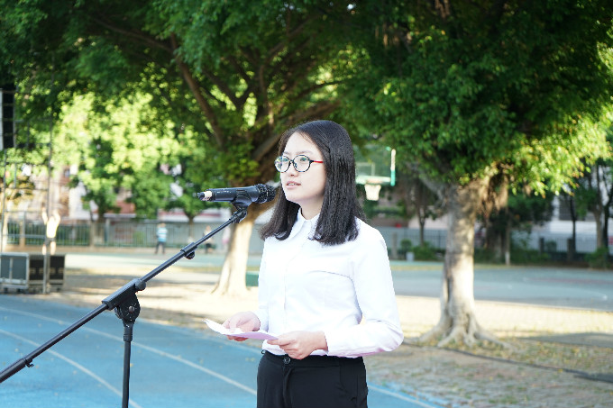 “升旗仪式现在开始”,一声令下。国旗队的护旗手们英姿飒爽,昂首挺胸,踏着整齐步伐迈进升国旗的区域。随着国歌的前奏响起,升旗手甩起国旗的那一刹那,同学们精神抖擞,眼睛凝视着那高高的旗杆上飘扬的国旗。升旗结束后,经济与管理学院2015级的陈丹玲同学发表演讲,给学弟学妹们提出了众多宝贵意见,发人深省,让人印象深刻。演讲结束,陈丹玲同学被甄选为“国旗下讲话”学生代表。
