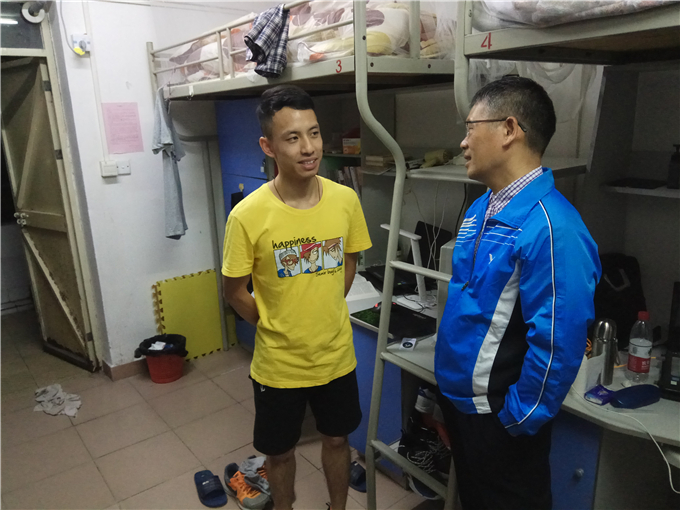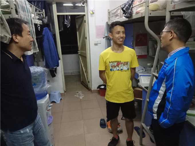 10月30日晚,法社学院潘荣新书记与辅导员老师一起走访学生宿舍,检查安全隐患。