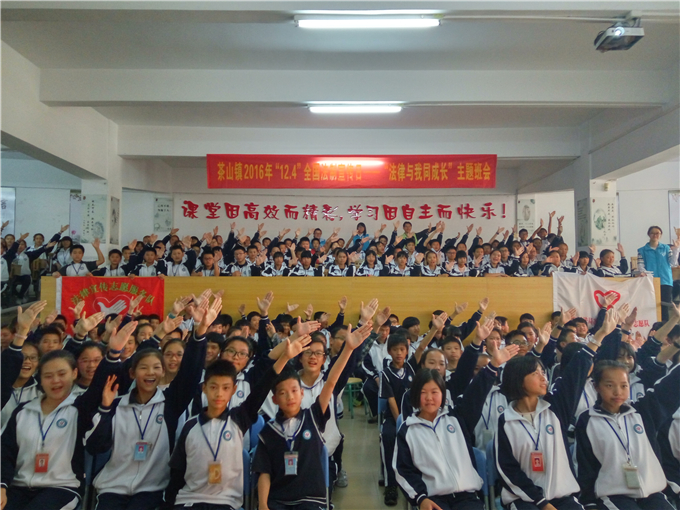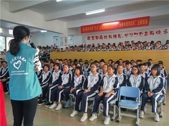 2016年12月2日,3044AM永利集团法律与社会工作学院团总支法律宣传志愿服务队为紧密与茶山司法分局的合作和深入志愿普法活动,同茶山社区的工作人员及社区矫正人员来到茶山镇誉华学校,为初中部的学生进行法制教育主题班会的授课以及为小学部学生开展法治宣传普法游园活动。