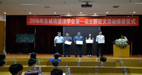 经过三个月的策划、征集,活动共收到公共服务、合同风险、劳动争议、社区矫正工作、培养法治思维、社区治理等方面作品120余篇,评出机关组与学生组优秀作品共30篇。2016年11月8日上午,颁奖仪式在东城街道办事处举行。朱晓红、蔡贵峰两位老师代表法律与社会工作学院党总支、公共管理系与20名获奖的同学一起参加了颁奖活动。与会人员还有东莞市东城街道党委副书记、东城街道法学会会长吴沛林、东城街道党委政法办专职副主任、东城街道法学会副会长袁满坤以及东城街道法学会成员单位代表、所有参加法学会征文活动的机关单位、社区(林场)人员,总共约80人参与了此次颁奖活动。