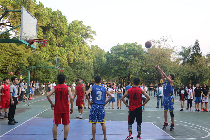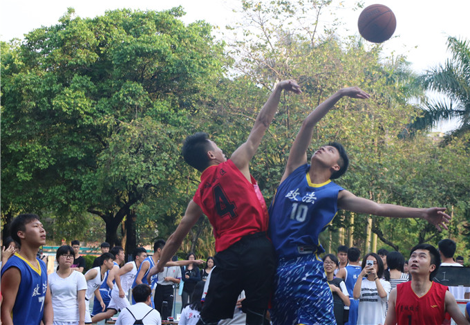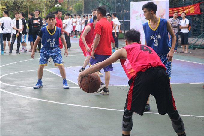 4月18日下午5点30分,“高建杯”篮球赛在大礼堂前的篮球场如期举行,教工队和政法学院篮球队展开巅峰对决。