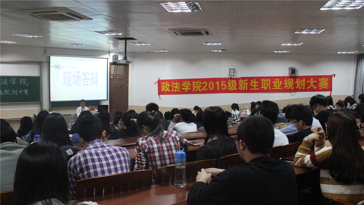3月31日下午2点30分政法学院2015级新生职业规划大赛决赛在莞城校区6#2室举行。本次职业规划大赛由王子枫师兄、陈俊洁师姐及梁偲敏师姐担任评委。本次职业规划大赛主要为了提高同学们的职业规划意识,引导同学们定位自己未来发展方向,规划未来。