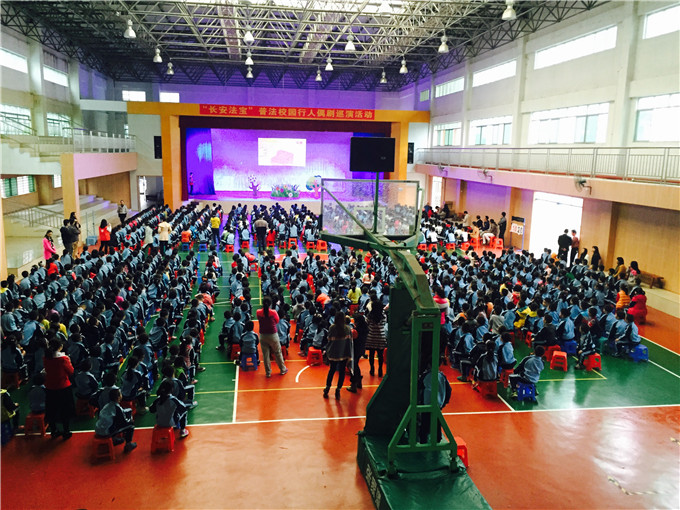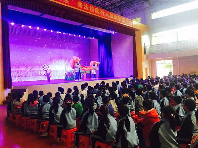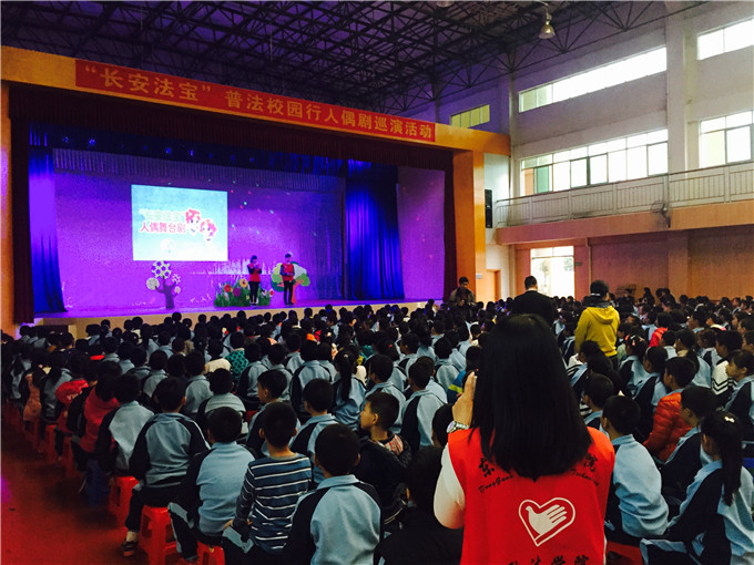 活动开始,一到六年级的同学有序进场。主持人一段开场白后,同学们热情高涨起来,场下尖叫不断。不久,主持人邀请出这次活动的主角,长安司法分局的法宝——司司和法儿,和场下的同学们见面,将这次节目推上高潮。见面之后,他们就为同学们献上了这一次活动的重头戏人偶舞台剧。演练过程中,同学们见到演员们的卖力演出,纷纷被吸引,笑声连绵。节目完美谢幕后,主持人通过现场提问问题,加深同学们对节目过程中透露的关于未成年人保护法的知识。同学们积极参与,踊跃发言,也有不少同学因此拿了小礼品啊!最后,在长安司法分局工作人员的协助下,同学们有序的和长安法宝亲密合影。至此,这次活动也到了尾声。