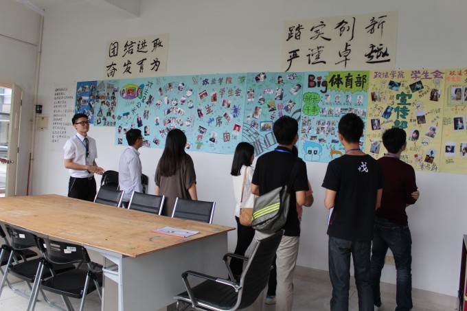 评比伊始,政法学院学生会主席黄劲锋首先带领评委考察团亲临学生会办公室。举目环视,从墙上的部门风采展示到我院院徽到学生会会歌,再到学生会日常工作档案记录。学生会办公室虽条件简陋,但人文关怀感备致。