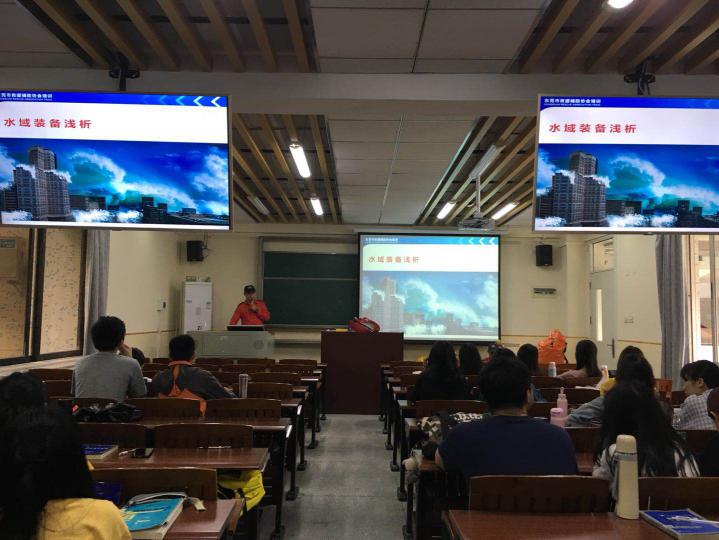 5月7日上午,东莞市救援辅助协会肖进军秘书长和技术培训导师黎启波教练应主讲老师丁淑娟博士邀请来到课堂。黎教练重点结合实践中紧急救援案例和常用的医疗救援装备,特别分享了紧急救援的“生命链”:“识别和启动应急反应系统-即时高质量心脏复苏-快速除颤-基础及高缓急救医疗服务-高缓生命维持和骤停后护理”。基于东莞市的地区性暴雨自然灾害频发特点,肖秘书长主要为同学们介绍了水域装备(救援头盔、救生刀、抛绳包和救生衣等)。在教练的指导下,同学们在愉快的互动气氛中体验了抛绳、救生衣、打绳结等救援装备或技巧。最后,两位专家特别强调大学生应该特别重视应急自救,保持镇静不要惊慌,不盲目地行动,选择正确的救助方法。本次实务专家进课堂极大丰富了实践教学效果,有利于增强学生危机预防和应对能力。