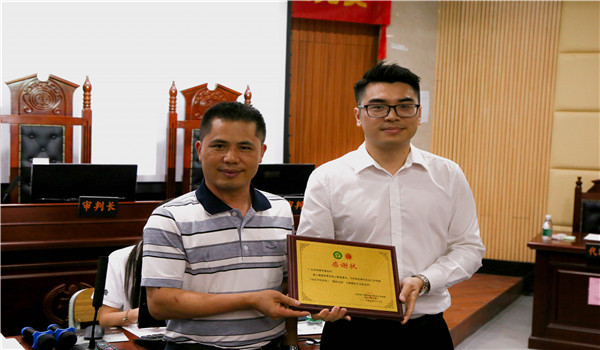 本次模拟法庭竞赛活动得到了广东权晔律师事务所的鼎力支持,比赛开始前,何柏林先生代表权晔律师事务所为本次活动致辞。何柏林表示,作为校友回到母校感到十分开心,他讲道,我国正在努力建设中国特色社会主义法治国家,法治意识在生活中必不可少,模拟法庭竞赛活动让同学们体验了法庭的魅力,提高了同学们法治意识。随后,丘永辉老师为何柏林先生颁发感谢状,其后为陈天宇法官、覃婴桃律师、田永健律师、陈斯俊律师、熊毅军博士颁发了指导专家聘书。