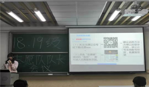 志愿服务站主任陈雅妮作为本次会议的主讲人,向各位志愿队长讲解了关于i志愿的使用和录入志愿时长所要注意的事项。同时她也阐述了志愿队长的职责,进一步明确其工作内容。