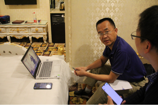 天色将晚之际,龚红兵老师为大家准备了丰盛的晚餐,并与参赛队员一起讨论了今天选手们的表现以及自己的一些看法,商量晚上排练事宜及明天正赛的准备工作。餐毕,龚红兵老师在房间里认真观看了同学们下午的排练视频,直观的了解同学们的不足并记录意见建议。