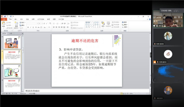首先,邹欢老师给贷款毕业生讲述了逾期不还款的危害,其中包括对日后房贷、车贷乃至工作产生的影响,旨在教育同学们要树立诚信意识,为人诚信,准时还款。然后,邹欢老师还对贷款利率和还款结点进行了特别说明。最后,助理对还款的具体操作和步骤做了详细说明。由于疫情,为加强交流,邹欢老师还提醒同学们日后有什么问题或者困难,可以在群里提出来。