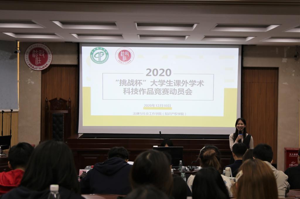 为推进营造创新创业良好氛围,不断提升实践育人实效,2020年12月10日下午两点,法律与社会工作学院(知识产权学院)于莞城校区模拟法庭成功举办“挑战杯”大学生课外学术科技作品竞赛动员培训会。出席大会的学院领导和老师有学院副院长朱晓红、法律系副主任吉海荣、社工系副主任张雪、知识产权系杨靖老师以及负责“挑战杯”大赛的辅导员邱可荣老师,学院各年级代表共100多人参加了此次动员会。