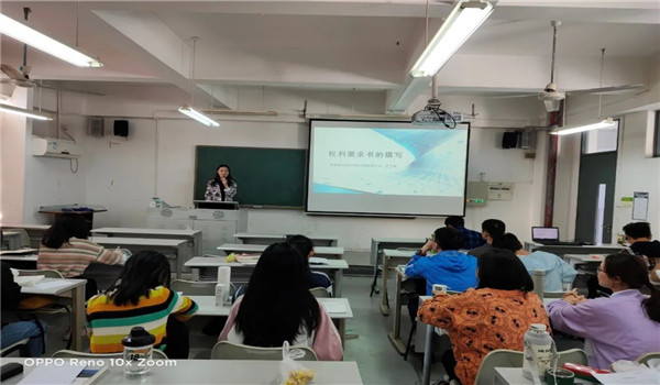 为加强学生对专利代理相关事务流程的了解,从11月开始,学院由张建超老师主讲的《专利法》课程根据专利代理师班的培养要求尝试了“企业进课堂”专题教学模式,由北京集佳知识产权代理公司东莞分公司连续四周安排公司实务专家给学生进校授课。
