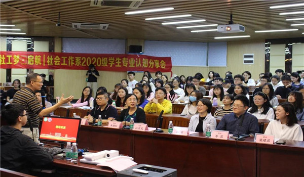 分享会伊始,党委书记杜应发以及副院长朱晓红发表了讲话。杜书记在言语中流露出对2020级社会工作专业学生的关心与期望,他为学生们分享了自己学习生涯的经验,以此激励社会工作专业学生更好地发展自己的未来。