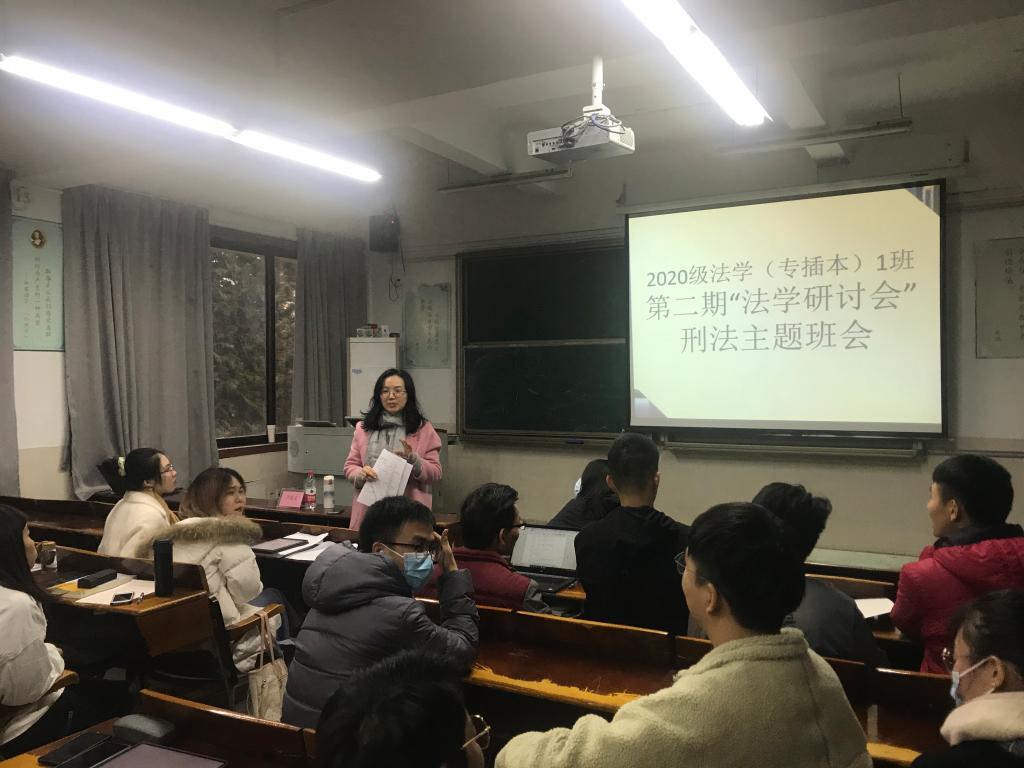 12月17日下午,2020级法学(专插本)1班在莞城校区2212举行一场《刑法》课程研讨会。本次研讨会邀请了吉海荣老师,通过对刑法犯罪未遂与犯罪中止的区别、正当防卫、共同犯罪、主观责任等八个课题的案例分享,现场学习研讨氛围良好,同学们充分地发表了自己的观点,吉海荣老师对同学们的课题分享做出了精确的点评。此次研讨会培养同学们的法律思维能力,加强同学们对专业知识的理解,同时也提升同学们的自主钻研能力、团队协助学习能力。(刑法研讨会)