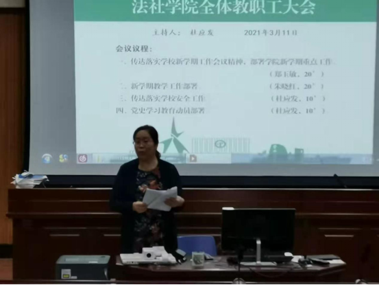 2021年3月11日,为贯彻落实新学期学校各项工作,法社学院在莞城校区模拟法庭召开全体教职工大会,会议由学院党委书记杜应发主持,法社学院全体教职工出席了此次会议。
