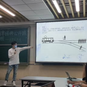 第一组分享的主题是“功利主义和道德主义”。刘泳廷同学首先运用经典问题“电车疑难”进行互动导入,向大家介绍了不同选择之下产生的两种思想——功利主义和道德主义,通过分别介绍两种思想的产生和内核,让大家充分认识和了解功利主义和道德主义的区别和现实意义。