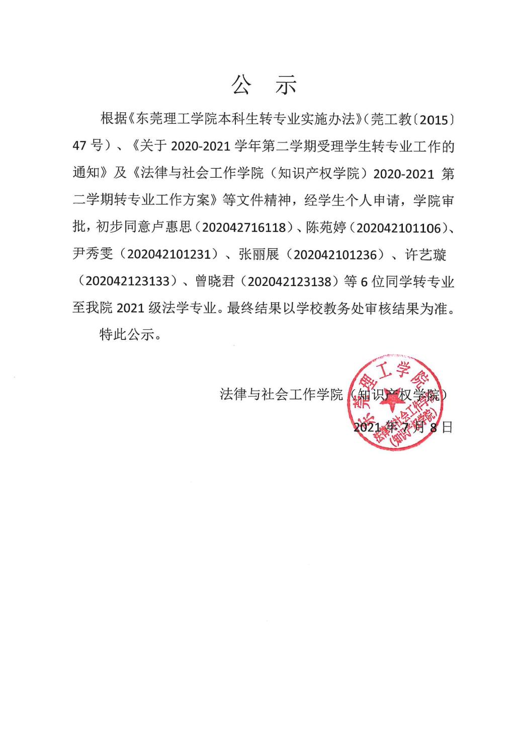 关于其他院系学生转专业至我院的公示