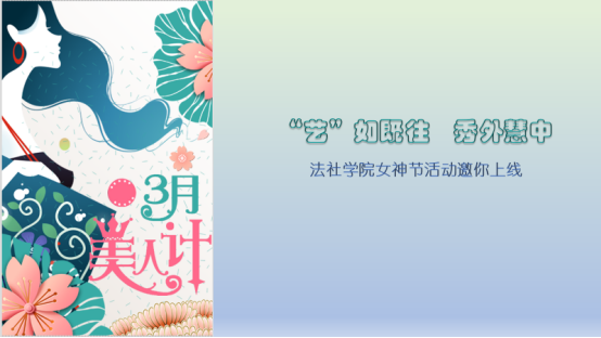 阳春三月,女同胞们迎来了属于自己的节日。往年的三八妇女节,法社学院分工会都会组织女教工们来一场户外踏青之旅。今年,恰逢新冠肺炎疫情期间,大家都在家中共同抗“疫”。开学初始,大家也进入了忙碌的教学行政工作状态。为了让大家在工作之余,仍然能过上一个开心的妇女节,也让久未见面的法社姐妹能够有机会畅聊一下,法社学院分工会发起了主题为“‘艺’如既往 秀外慧中“的线上才艺展示活动。